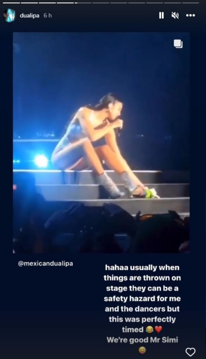 "Usually when things get thrown on stage they can be a safety hazard for me and dancers, but this was perfectly timed. We're good Mr. Simi", se lee en el reposteo de una historia de Instagram.