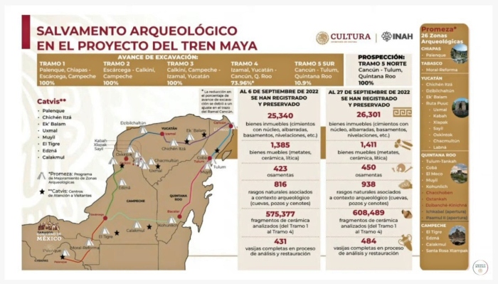 El titular del INAH informó que se avanza en la investigación y protección del patrimonio que se ha identificado a lo largo de toda la ruta del Tren Maya. Añadió que del Tramo 1 al Tramo 3 del Tren Maya están concluidas las excavaciones.