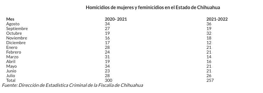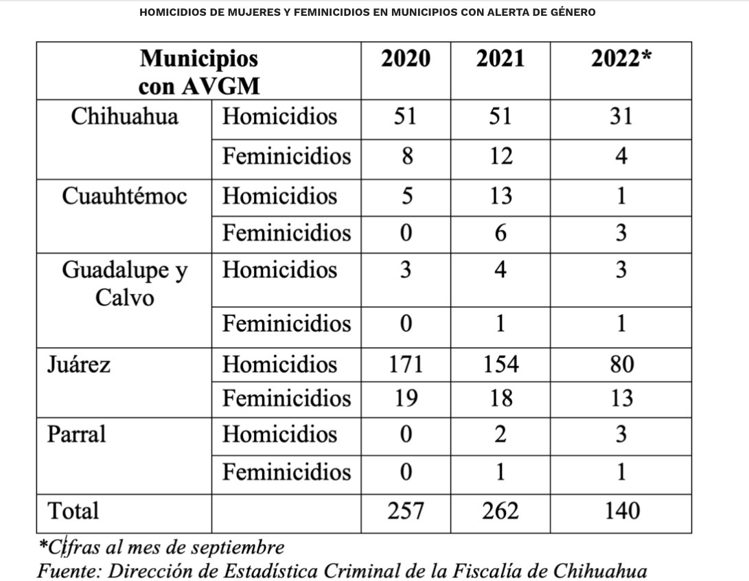La violencia contra la mujeres prevalece incluso en los municipios de Juárez, Chihuahua, Guadalupe y Calvo, Hidalgo del Parral y Cuauhtémoc, donde especificamente el mecanismo de la alerta se activó en agosto del 2021 para evitar muertes violentas, así como la violación sistemática de los derechos humanos de las mujeres.
