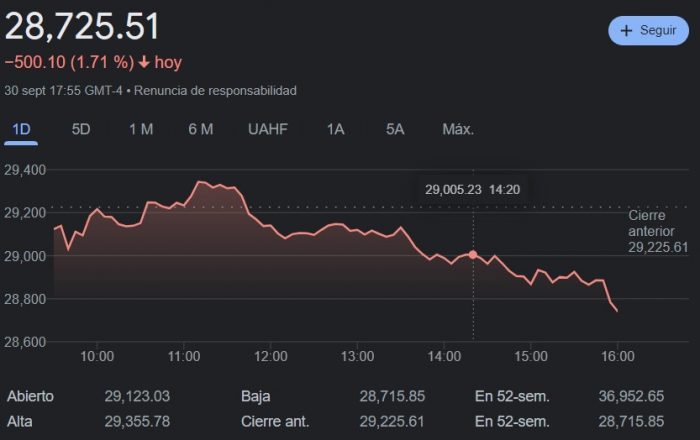 El mercado se encamina a cerrar un mes en rojo, y dará fin también a un trimestre cargado de volatilidad. El Dow Jones podría terminar septiembre con una caída de siete por ciento, su peor septiembre desde 2002, incluso peor que el año de la crisis hipotecaria y financiera de 2008. Mientras que el S&P 500 perdió ocho por ciento y el Nasdaq tres por ciento. Todos en terreno bajista.