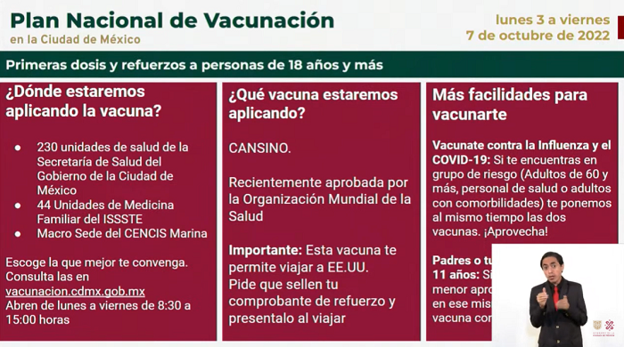 Esta jornada de vacunación se llevará a cabo en 230 unidades de salud de la Secretaría de Salud de la Ciudad de México, 44 unidades de Medicina Familiar del Instituto de Seguridad y Servicios Sociales de los Trabajadores del Estado (ISSSTE) y la macro sede del CENCIS Marina. El horario para recibir la vacuna será de 8:30 a 15:00 hrs.