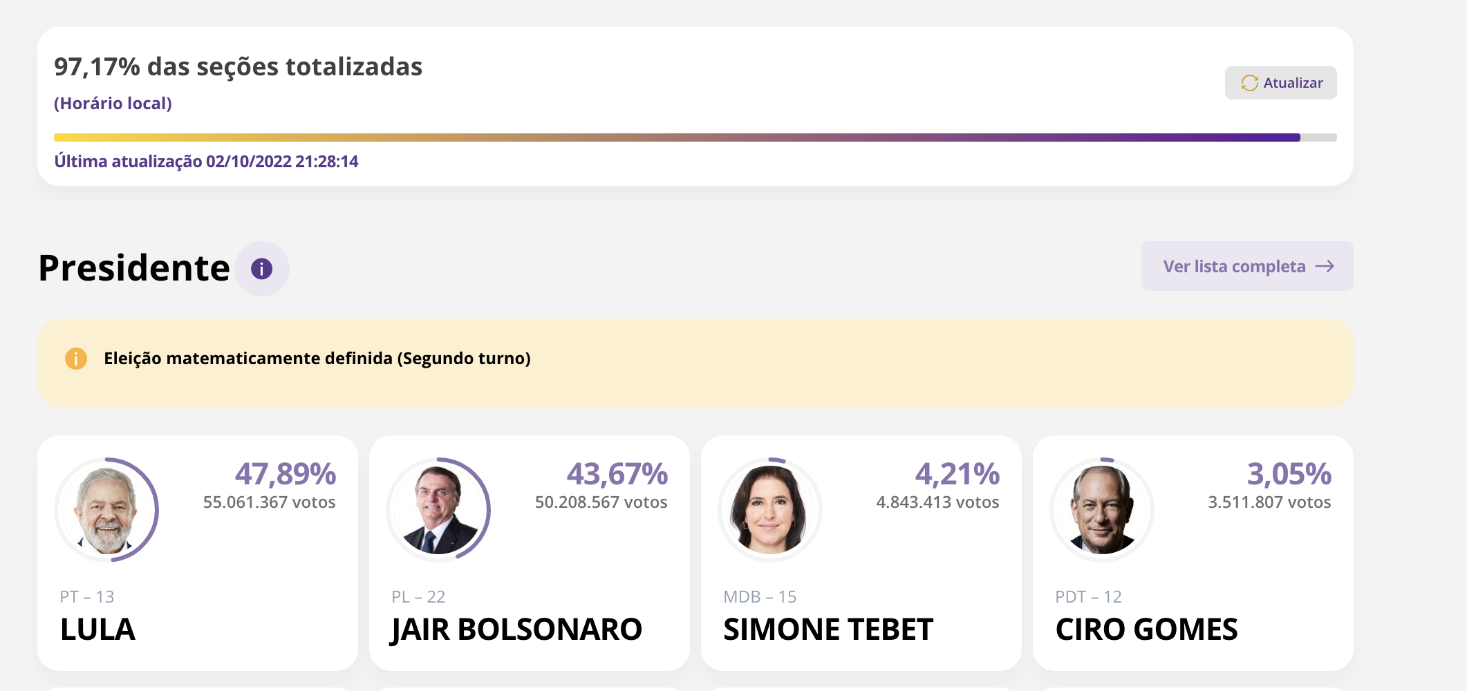Con el 97 por ciento de los votos escrutados, Lula tenía el 47.9 por ciento de los sufragios por 43.6 por ciento de Bolsonaro. Dado que ninguno de los dos candidatos recibió más del 50 por ciento de los votos válidos, que excluyen los votos nulos y en blanco, se programará una votación de segunda vuelta entre ellos para el 30 de octubre.