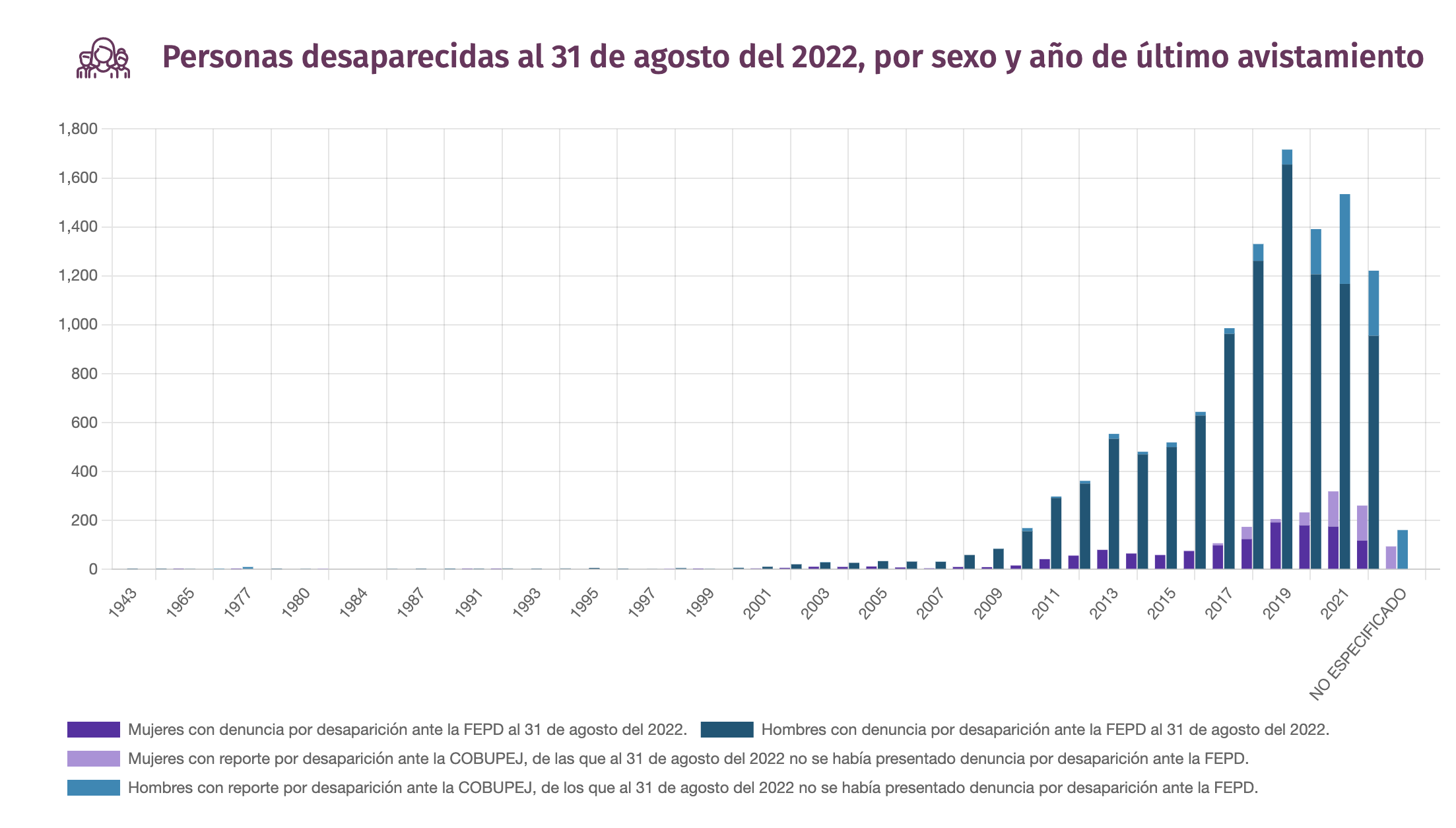 En los primeros dos años del Gobierno de Alfaro, de diciembre de 2018 cuando asumió y hasta diciembre de 2020, Jalisco se mantuvo como la principal entidad con más reportes de desaparecidos (tres mil 724 casos de los 16 mil 875 en total del país). Esto representó un 22.6 por ciento del total, es decir, una de cada cinco desapariciones a nivel nacional ocurrió en dicho estado durante ese periodo.