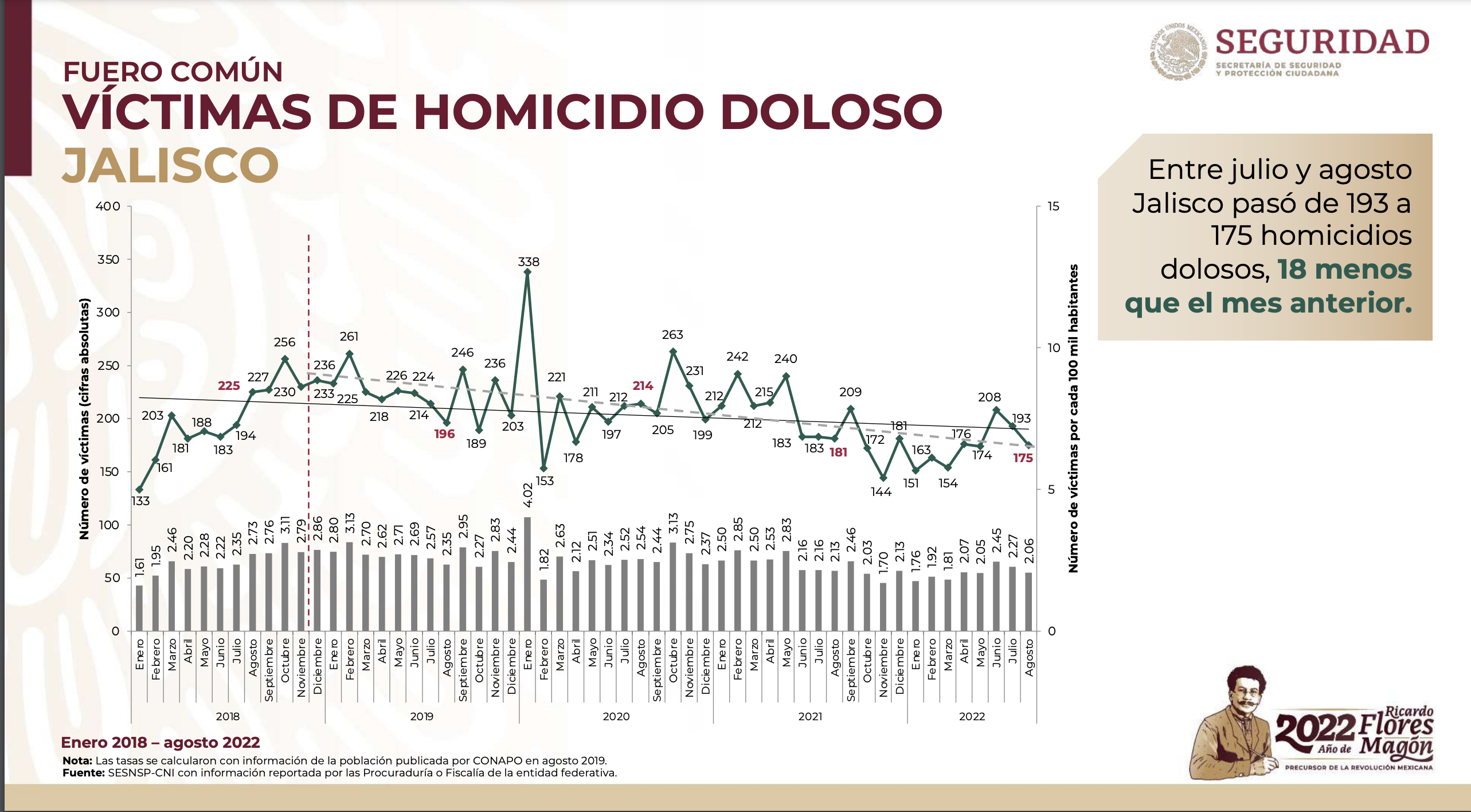 Para el periodo de enero a agosto de 2022, Jalisco se ubica como la quinta entidad más violenta del país, y junto a Guanajuato, Baja California, Michoacán, Estado de México y Chihuahua, acumulan el 48.7 por ciento de todos los homicidios dolosos del país.