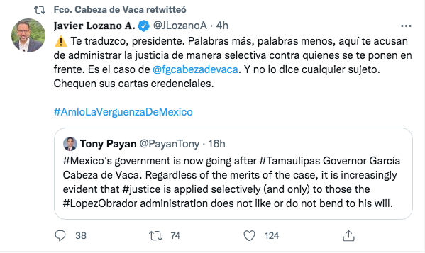 Sin embargo, la defensa legal del exmandatario aseguró que su cliente está de vacaciones en su rancho. El mismo García Cabeza de Vaca ha estado muy activo en redes retuiteando mensajes de apoyo y otros en contra del actual Gobierno federal.
