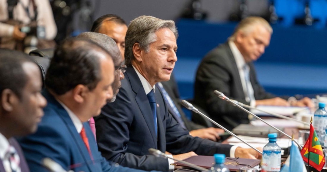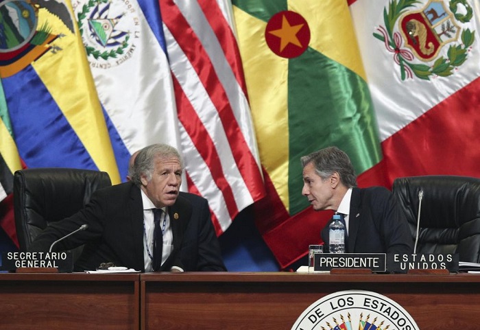 El secretario de Estado de los Estados Unidos, Antony J. Blinken, a la derecha, habla con el secretario general de la Organización de los Estados Americanos (OEA), Luis Almagro, en la 52.ª Asamblea General de la OEA en Lima, Perú, el jueves 6 de octubre de 2022. Foto: Guadalupe Pardo, AP