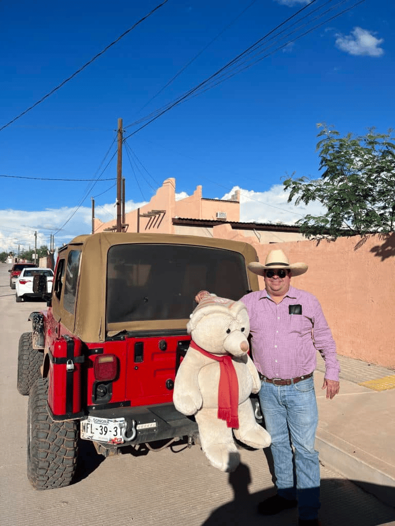 Subimos a su auto, un Jeep color rojo manzana con un oso de peluche de casi un metro de altura atado a la llanta de repuesto de la parte trasera. Mientras dábamos vueltas por la ciudad, el padre saludaba a todos con un signo de paz y un “¡Ay!” gutural.