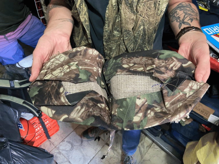 Dentro de una de las tiendas, cubierta por mochilas que colgaban en hilera, los vendedores ofrecían sudaderas de camuflaje por 300 pesos mexicanos (unos US$15). En la parte de atrás, ocultos a la vista, también vendían botines de camuflaje por 120 pesos (alrededor de US$6), que los migrantes usan sobre sus zapatos para no dejar huellas en su trayecto por el desierto.