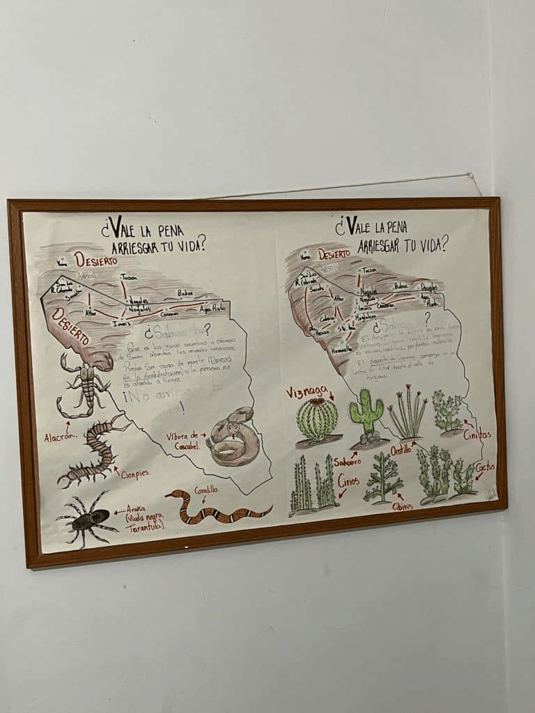 A la izquierda de la mesa, sobre la pared que conduce a la entrada de la sala principal, cuelga un diagrama de dos partes con dibujos que ilustran a los migrantes sobre la flora y la fauna que pueden encontrar al cruzar el desierto.
