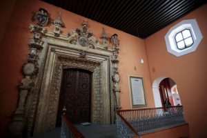 La puerta que conduce al interior de la Biblioteca Palafoxiana, la biblioteca pública más antigua en América, el martes 13 de septiembre de 2022 en la ciudad de Puebla, México. Foto: Pablo Spencer, AP