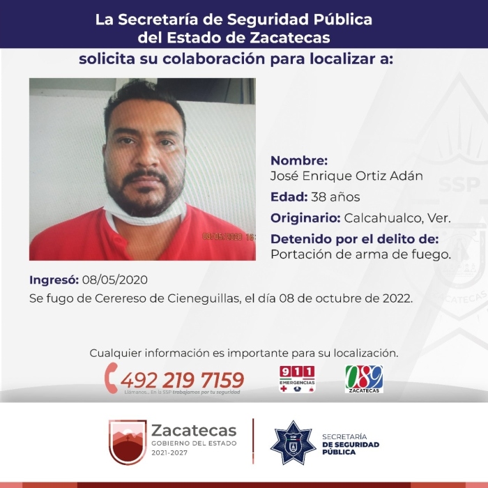 El segundo reo se llama José Enrique Ortiz Adán, de 38 años, originario de Calcahualco, Veracruz. El hombre fue ingresado al penal el 8 de mayo de 2020 por el delito de portación de arma de fuego.