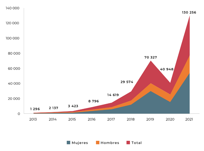 "Durante 2021 después de Estados Unidos y Alemania, México se ha convertido en el tercer país con más solicitudes de refugio en todo el mundo, al rebasar la cifra de 130 mil solicitudes recibidas; donde se destaca la participación de las mujeres a través de las solicitudes presentadas", destaca.