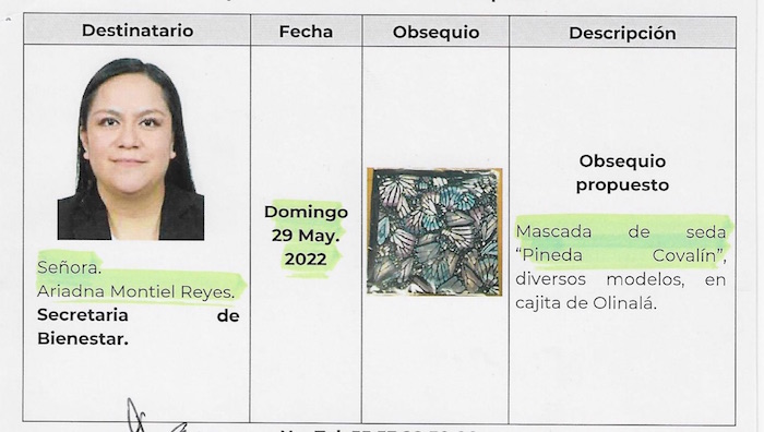 También están los documentos de las propuestas de regalo. Para Isabel Arvide, Embajadora de México en Turquía, se le dio a escoger al General entre un juego para café expreso en baño de plata fina, una bolsa Pineda Covalín o una mascada de la misma marca.