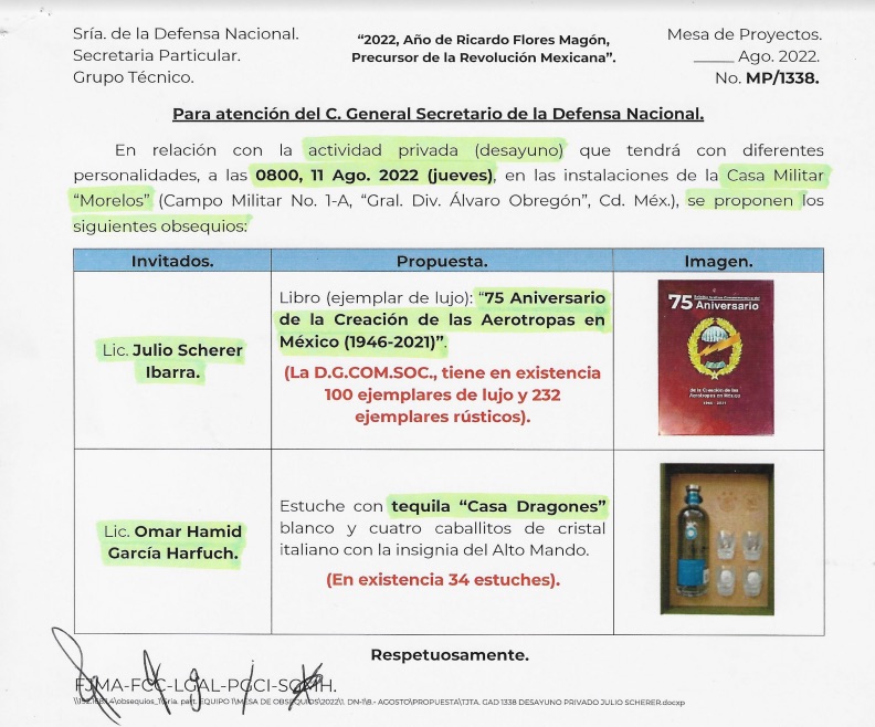 Un documento enviado por la Secretaría Particular del General Secretario que consta de 5 páginas, fechado en agosto de 2022, inicia con una propuesta de obsequios para un desayuno privado en el Campo Militar Número 1 con Julio Scherer Ibarra, exconsejero Jurídico de la Presidencia y Omar García Harfuch, Secretario de Seguridad Ciudadana de la Ciudad de México.