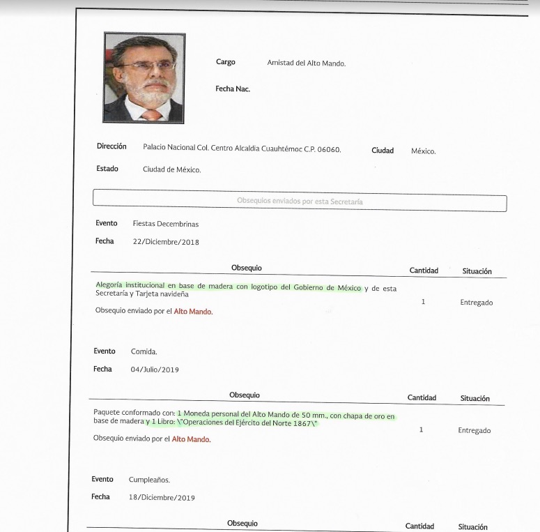 El mismo documento muestra una lista de todos los obsequios que han sido enviados a Scherer Ibarra, quien es catalogado como “amistad del Alto Mando”.