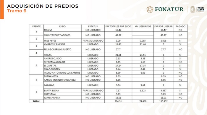 Al 29 de agosto, el tramo 5 norte llevaba 2 por ciento de superficie liberada; el 6, un 29.16 por ciento y el 7, un 46 por ciento, de acuerdo con los avances enviados por Fonatur al General de Brigada Intdte. D.E.M. Óscar David Lozano Águila.