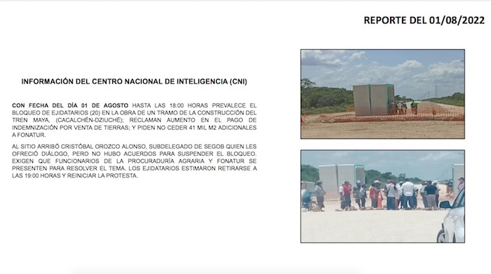 “Un grupo como de 30 campesinos de Cacalchén tenían cerrado el paso con piedras (…) están reclamando el pago por el paso del Tren Maya en sus tierras”, dice el reporte. “Reclaman aumento en el pago de indemnización por venta de tierras y piden no ceder 41 mil metros cuadrados adicionales a Fonatur”.