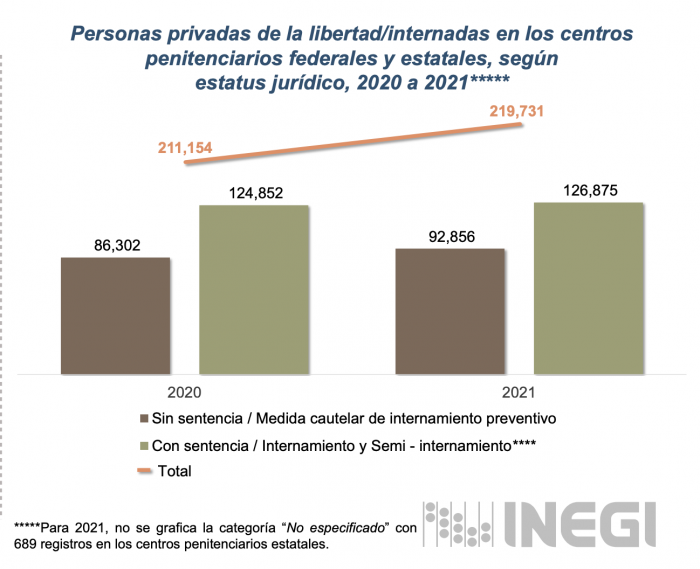 En México, el número de personas internas en los centros penitenciarios federales y estatales sin una sentencia creció al menos un 7.6 por ciento al cierre del año 2021 con respecto al anterior inmediato de acuerdo con el más reciente Censo Nacional de Sistema Penitenciario en los ámbitos estatal y federal (CNSIPEE-F) 2021, elaborado por el Instituto Nacional de Estadística y Geografía (Inegi).