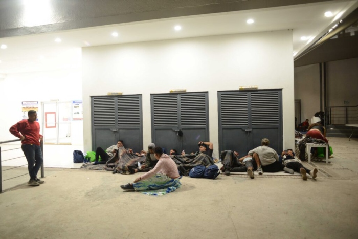Algunos usan sus mochilas y chamarras como cobertores y cobijas para no recostarse en el piso frio, por el clima que se registra en la región en esta época de otoño. Los albergues para migrantes en la ciudad están saturados.