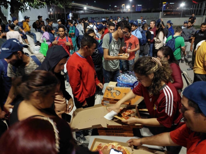 La noche de este viernes, venezolanos refugiados en la ciudad y voluntarios, que se hacen llamar Grupo Chévere, llevaron cajas con pizza para ofrecer como cena a sus connacionales que permanecen en la vía pública luego de su retorno de El Paso, Texas.