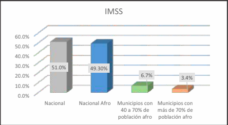 Por ejemplo, aunque más del 70 por ciento de las personas en los municipios con mayor población afro están afiliadas a instituciones públicas de salud, el estudio realizado por Muafro y el ILSB indicaron que "este dato es engañoso, dado que la mayoría se encuentra afiliada al Instituto de Salud Bienestar (Insabi), dado que sin fuentes de empleo formal no existe Seguridad Social, la media nacional y la nacional afromexicana de afiliación este instituto es de 35.5 por ciento y mientras que en los municipios con 40 por ciento de población afro es de 78.7 por ciento y en aquellos con más de 70 por ciento es de 85.3 por ciento".