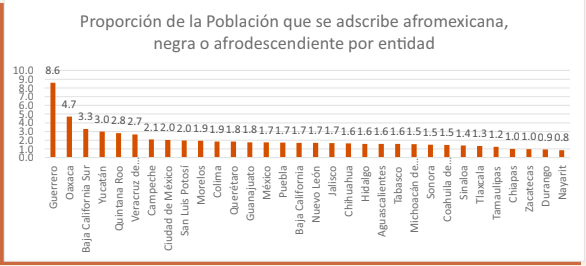 De la población total mexicana, el 2.04 por ciento se considera como afromexicana, negra o afrodescendiente: es decir, dos millones 576 mil 213 personas. El 50.4 por ciento son mujeres y el 49.6 por ciento restante son hombres, y tienen una presencia proporcionalmente mayor en los estados de Guerrero (8.6 por ciento), Oaxaca (4.7 por ciento), Baja California Sur (3.3 por ciento), Yucatán (3.0 por ciento), Quintana Roo (2.8 por ciento), Veracruz (2.7 por ciento) y Campeche (2.1 por ciento).
