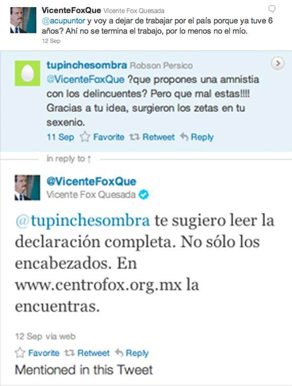 Ya hace casi un sexenio que Vicente Fox Quesada dejó la silla presidencial en México, sin embargo es ahora cuando más presente está en la política nacional. La "Invitación a la audacia" de brindar amnistía a los delincuentes no fue bien recibida por los malos entendidos que provocó, a decir del expresidente, quien no pierde la oportunidad para reafirmar su "compromiso latente con el país". No obstante, sorprende más que pierda tanto el tiempo, enfrascándose en estériles discusiones en Twitter a la primer provocación, en lugar de dar a entender mejor sus propuestas.