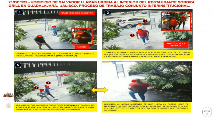 "Por ejemplo, en el caso del homicidio de Aristóteles Sandoval, exgobernador de Jalisco, en el bar Distrito 5 en Puerto Vallarta, donde también en el mismo lugar había personas desperdigadas en el lugar y después fue asesinado por una supuesta pareja cuando descendía de unas escaleras al haber llegado al baño", agregó el Subsecretario.