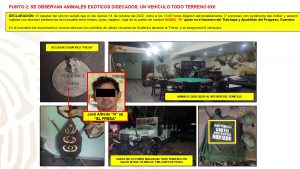 En dicho laboral, aseguraron tres bolsas con sustancias cristalinas, un recipiente con sustancia sólida cristalina blanca, 25 animales exóticos, cinco animales de granja y cinco vehículos.