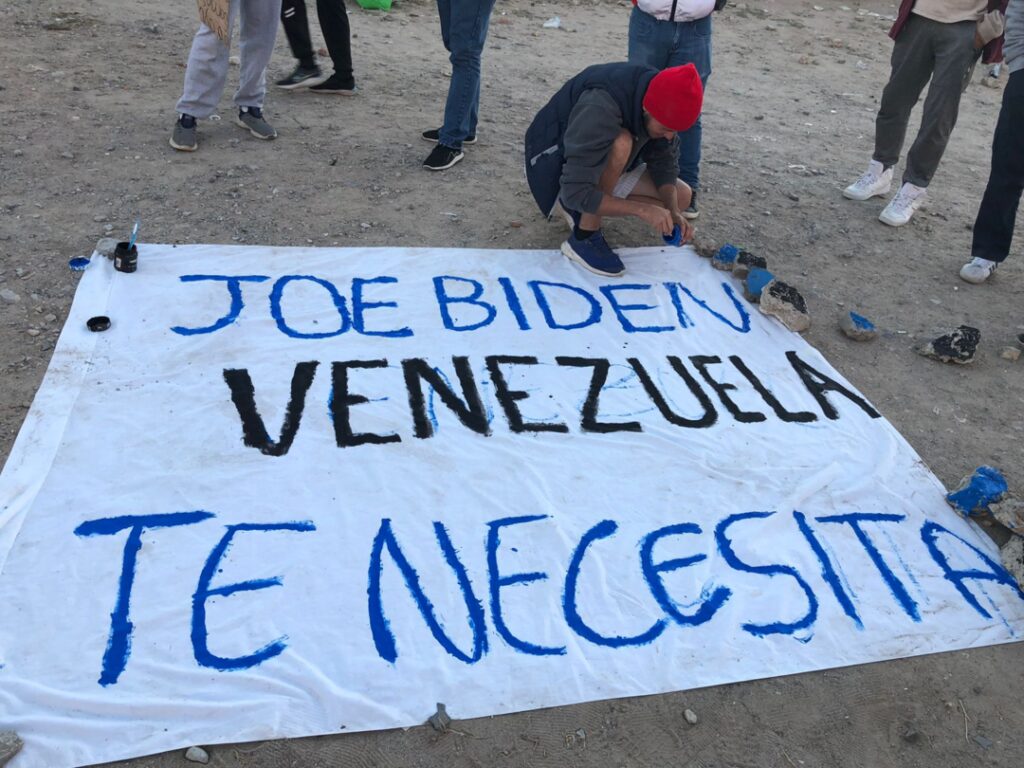 En el piso del lugar, los venezolanos formaron la palabra ‘SOS’ con piedras, algunas pintadas en azul. Además, escribieron mensajes en dos mantas, en las que se lee: “Joe Biden Venezuela te necesita” y “SOS. Presidente Joe Biden somos de la dictadura de Venezuela. The Good ones are more”.