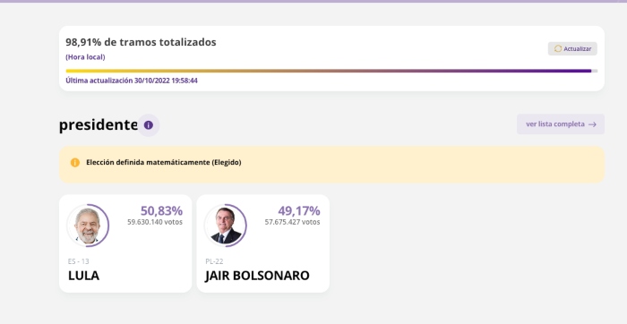 Con más del 99 por ciento de los votos computados, Lula llevaba 50.9 por ciento y Bolsonaro 49.1 por ciento, ante lo cual la autoridad electoral dijo que la victoria de Lula estaba matemáticamente asegurada.