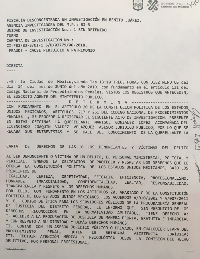 "Una de mis sobrinas se interesó en un lugar para trabajar y preguntamos por los precios; nos dijeron que ya tenían dueño y que era un señor que tiene un despacho de abogados en Polanco, que él ya lo había adquirido todo, pero que iba a hacer 10 puestos y 10 bodegas", recordó Marisol, cuya sobrina fue defraudada al entregar un anticipo de 30 mil pesos a Roberto Benezra Farji, supuesto dueño del despacho jurídico Benguiat, Benezra & Asociados, localizado en Masaryk número 101 en Polanco V Sección.