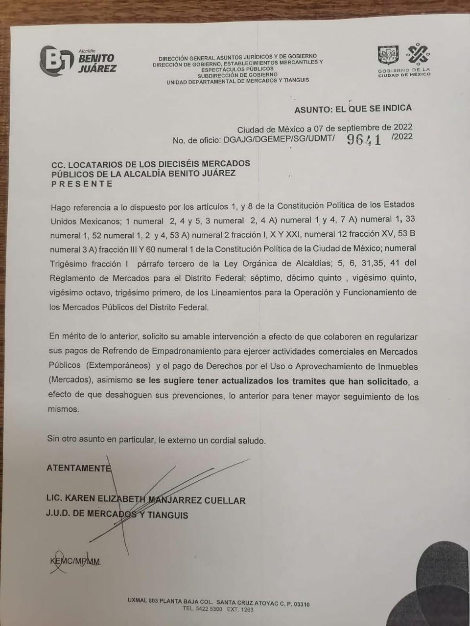 Los comerciantes de los mercados en la Benito Juárez también piden al Gobierno de la Ciudad de México revisar la normativa de los mercados sobre el uso de los Cendis y llamar a cuenta a los alcaldes para deslindar responsabilidades si se violó la Ley.