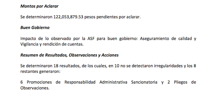 La Auditoría encontró en la revisión del gasto que el dinero no se reintegró de manera adecuada a la Tesorería de la Federación; hubo gastos injustificados; pagos por servicios que no se sabe si se recibieron y en general, opacidad en el gasto.