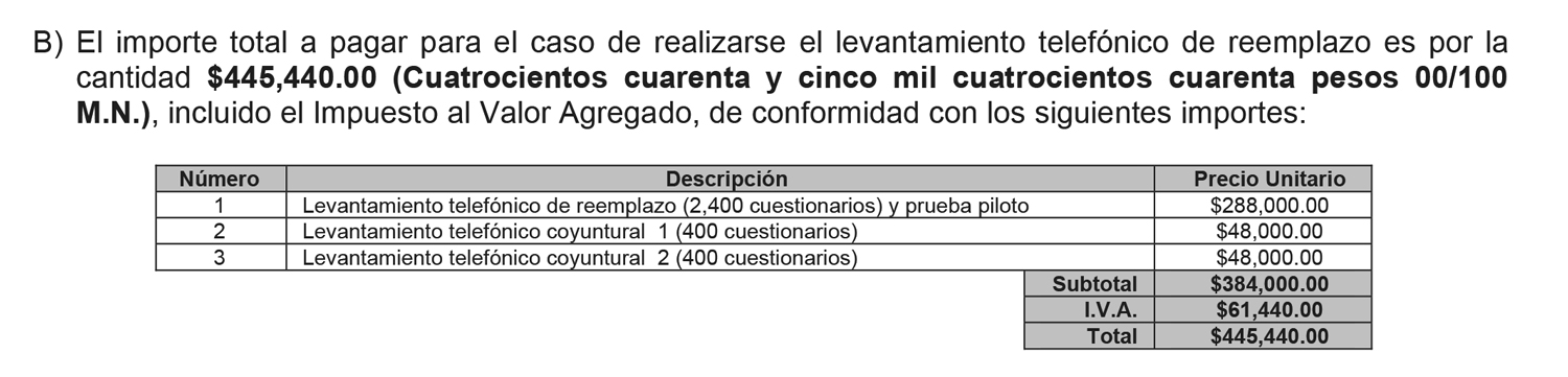 1. Levantamiento telefónico de reemplazo (2 mil 400 cuestionarios y prueba piloto) por 288 mil pesos.