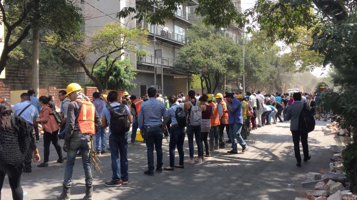 En medio del pasmo y la incredulidad, Araceli voltea a su alrededor y sus ojos se encuentran con tres escenas que, en ese momento, no es capaz de procesar: uno, decenas de personas hacen una fila, para poder pasar, de mano en mano, grandes piedras; dos, un grupo de albañiles carga polines de madera y apuntala la entrada del edificio, y tres, el chofer de una ambulancia, estacionada en la esquina, está absorto en su celular, quizá porque la incredulidad lo venció. Él, posiblemente, como muchos capitalinos, no imaginaba que los sedimentos de la ciudad–lago–monstruo volverían a crujir 32 años después, para demostrar que encarnamos fragilidad.