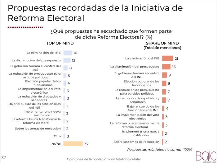 Sobresale que quienes dicen conocer la Reforma, el tópico que más han escuchado es que ésta busca la “eliminación del INE”, seguido de “disminución del presupuesto”, que “el Gobierno tomará el control del INE”, de “la reducción de presupuesto para partidos políticos” y de la “elección popular de los funcionarios”.