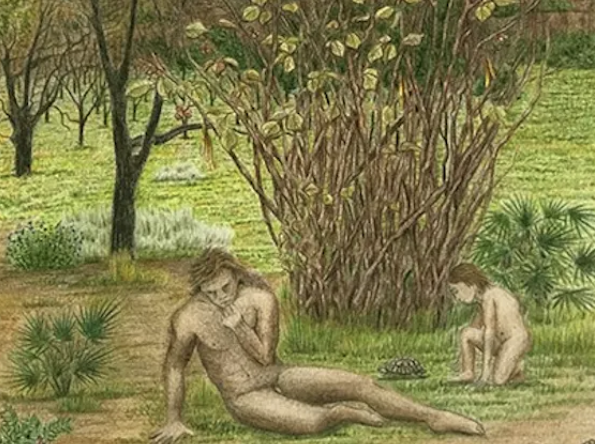 Apoyándonos en la ciencia, hemos querido representar un instante de un grupo neandertal, un momento de descanso y de esparcimiento cómplice entre un padre, que deja una especie de lanza sobre el suelo rindiéndose a la degustación de las avellanas, y su hijo, absorto en el paso de una tortuga. Ambos están perfectamente integrados en el entorno y se sirven de él de forma pacífica. Un retrato de familia en armonía con el paraíso.