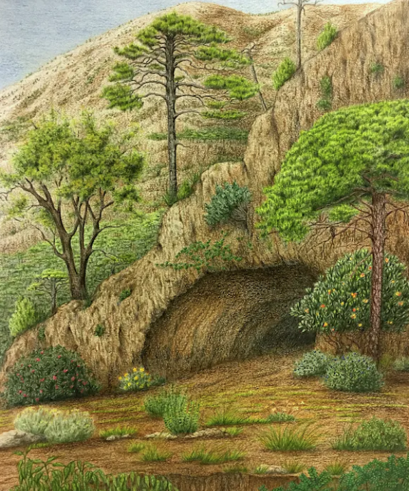 Por el gran interés paleobotánico que mostraron los hallazgos en esta cueva, decidimos hacer una reconstrucción de paisaje con una selección de las plantas que formaron parte de este entorno y que presentan mayor valor en la definición del ecosistema del momento. La palinología, o análisis del polen fósil encontrado y estudiado por el grupo ECCE HOMO de la Universidad de Murcia, nos ha proporcionado información de las plantas que crecían allí, un gran número de especies vegetales, muchas de ellas con frutos comestibles. Hasta donde sabemos, no existe un registro similar de paisaje forestal que se haya descrito en un contexto glacial. Al menos, no con tanta densidad y diversidad de plantas leñosas.