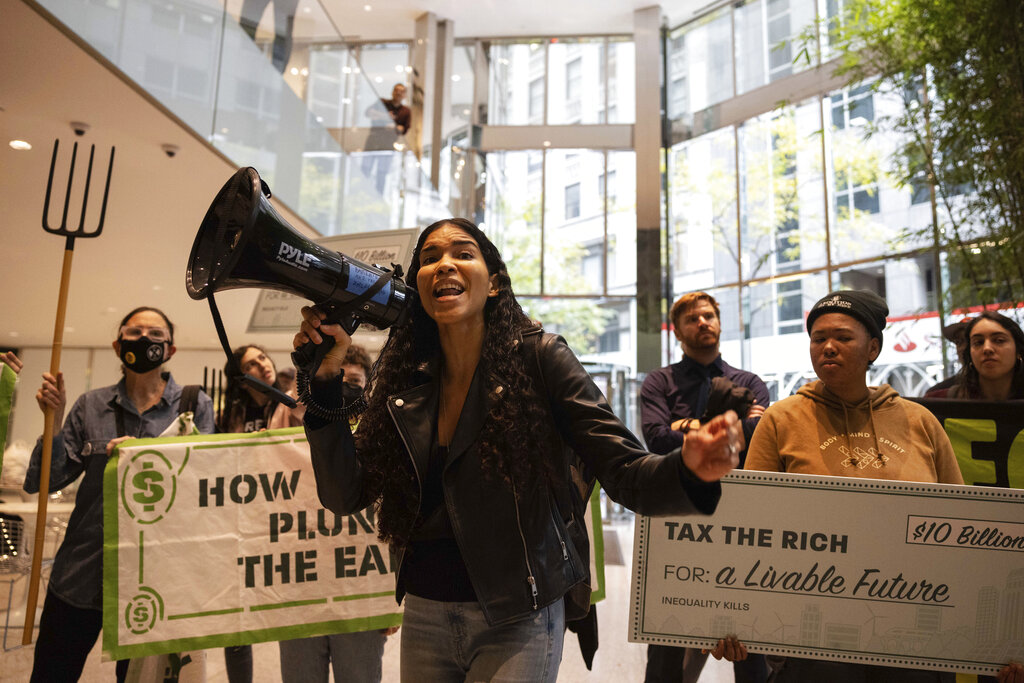 Una activista climática habla mientras ella y otras personas bloquean una escalera mecánica en la sede en Nueva York de BlackRock. Foto: Yuki Iwamura, AP.