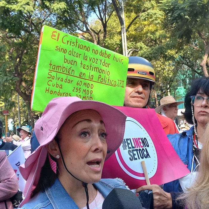 Con sus pancartas, los asistentes insistieron en que el Presidente López Obrador es “un dictador” y busca mantenerse en el poder al promover a un sucesor afín a él. "No podemos permitir que un dictador diga quién va a gobernar; salgamos a defender al INE", expusieron los manifestantes.