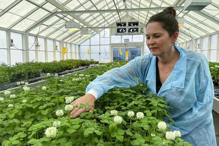 Los análisis de laboratorio muestran que el trébol modificado reduce la producción de metano entre 15 por ciento y 19 por ciento, dijo Johnson.