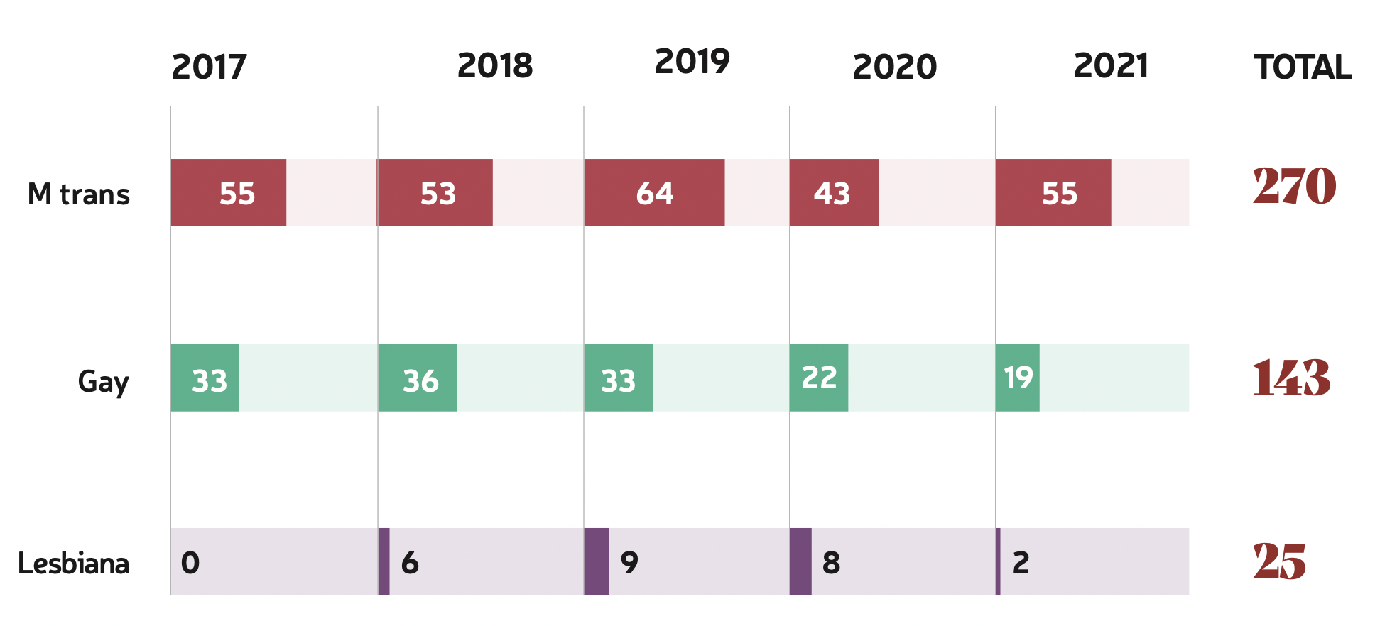 "Esta cifra es una aproximación a la real, ya que el registro se basa en fuentes indirectas. La cifra real se ubicaría en 179 homicidios de personas LGBT tan solo en ese año, de acuerdo con un cálculo realizado con base en un estudio", detalló la asociación en el informe. "El número tan bajo de muertes violentas de mujeres lesbianas y bisexuales registradas no debe interpretarse de manera errónea y subestimar el impacto de este tipo de violencia de género, ya que suelen investigarse sólo en función del género, dejando a un lado la orientación sexual de la víctima como posible motivación del delito."