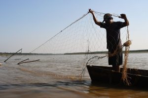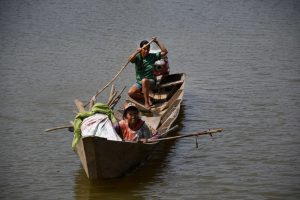 Son las cuatro de la tarde del último jueves de agosto de 2022, y con 35 grados centígrados de temperatura las familias se afanan por realizar diferentes tareas. Algunas mujeres destripan pequeños pescados recién atrapados, las más jóvenes se cubren del fuerte sol bajo los campamentos armados con palos y trozos de nylon o telas, los hombres desenredan las redes y los niños corren desnudos y se bañan en las aguas del río.
