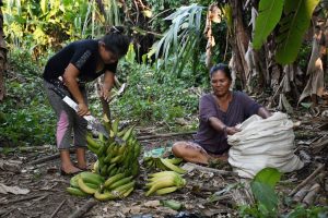 Allí, Adela Costa, de 58 años, termina de cosechar plátano verde junto a su nuera e hijo. Mientras se acomoda la bolsa de plátanos en la cabeza, cuenta que, en muchas ocasiones, los cultivos quedaron anegados por la crecida del río.