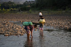 Son las cinco de la tarde y Adela se apura en regresar a su casa a través del río, tiene muchas otras tareas por hacer. Entre otras actividades, ella también se dedica a la crianza de gallinas ponedoras, proyecto del Plan para Pueblos Indígenas (PPI), desarrollado con dinero de la compensación, que beneficia a menos de la mitad de las familias.