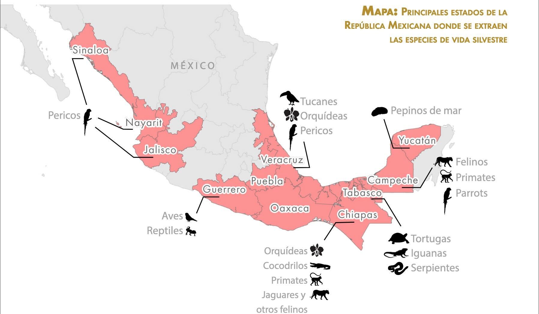 El informe revela que muchos animales son capturados en estados del sur de México y a lo largo de la costa Pacífica, y desde allí son llevados principalmente por tierra hasta grandes centros urbanos, como Ciudad de México, Guadalajara, Monterrey y Tijuana.