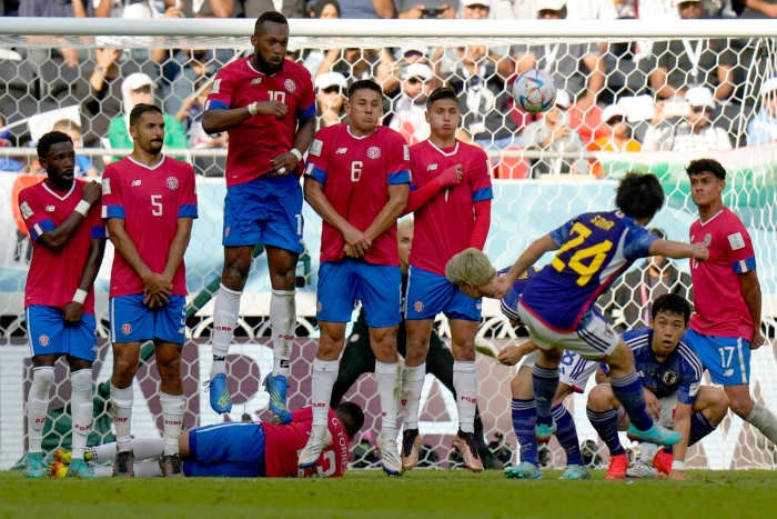 Los jugadores costarricenses defienden un tiro libre del japonés Yuki Soma durante el juego del Grupo E del Mundial entre ambos equipos, en el estadio Ahmad Bin Ali en Rayán, Qatar, el 27 de noviembre de 2022. Foto: Francisco Seco, AP.