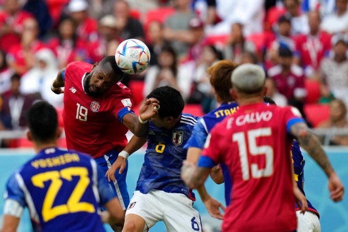 El costarricense Kendall Waston (izquierda) y el japonés Wataru Endo saltan por un balón durante el partido del Grupo E del Mundial que enfrentó a ambos equipos, en el estadio Ahmad Bin Ali en Rayán , Qatar, el 27 de noviembre de 2022. Foto: Francisco Seco, AP.