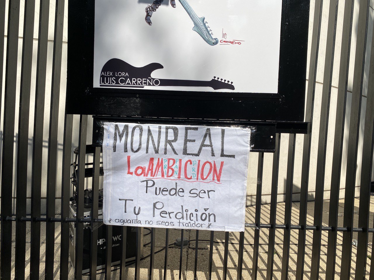 Manos anónimas fijaron una cartulina rotulada en las rejas del Senado, alusiva al comportamiento del coordinador de los senadores de Morena: “Monreal, la ambición puede ser tu perdición. Aguanta, no seas traidor”.